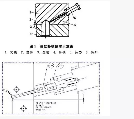 定模抽芯用油缸驅動,大大簡化模具結構,降低成本;但需注意動作順序的控制和滑塊鎖緊,以免動作錯亂損壞模具或油缸鎖緊力不足而無法封膠,抽芯力不足而抽不動滑塊。