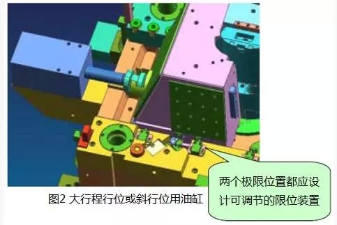 在模具結構中油缸應有行程限位控制開關,確保活塞端隙;同時應具備模具生產時自動控制所必須的信號源。